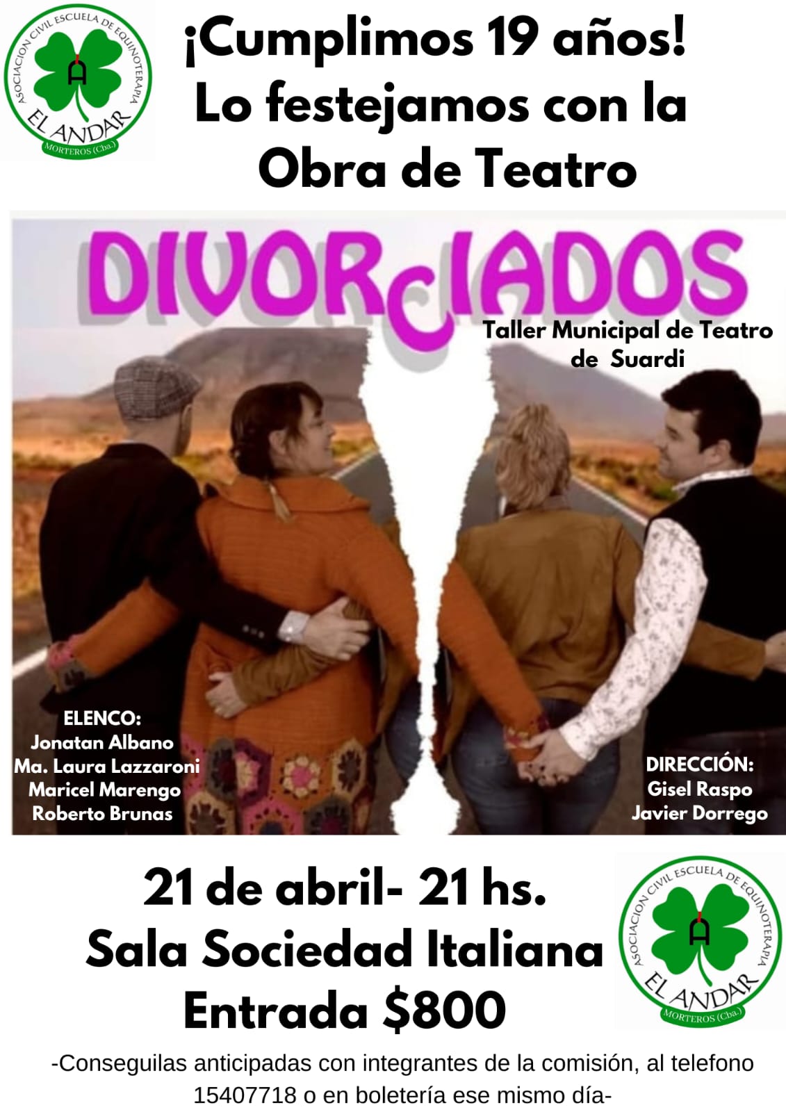 “Divorciados”, obra del Taller Municipal de Teatro de Suardi, bajo la dirección de Gisel Raspo y Javier Dorrego. Con la actuación de Jonatan Albano, María Laura Lazzaroni, Maricel Marengo y Roberto Brunas. Viernes 21 de abril, 21hs en Sociedad Italiana.