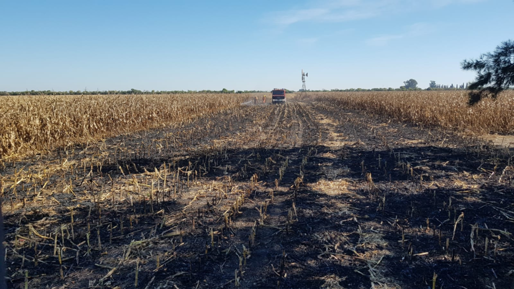 Minutos después de las 14hs. Bomberos son alertados por un incendio forestal en la zona rural. “En el lugar nos encontramos con un incendio de rastrojo de maíz con una zona afectada de 15x200mts. Se utilizaron 1800lts de agua y dos líneas de 1 pulgada. El Incendio se había producido por un desperfecto mecánico en una máquina trilladora”.