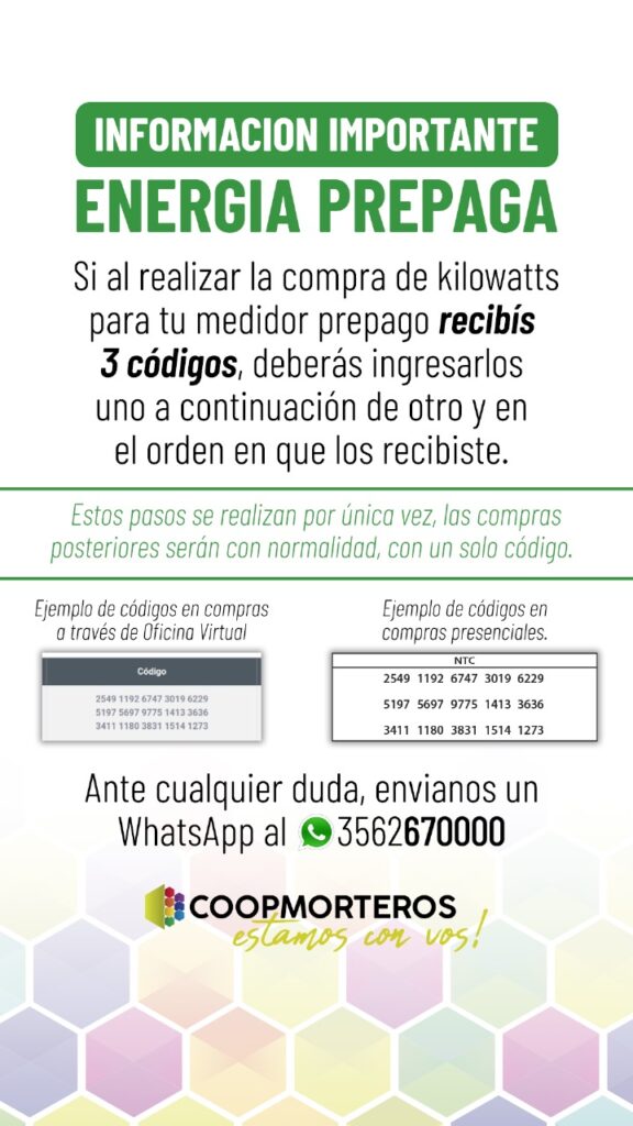 Coopmorteros informó que el sistema de energía prepaga ya está funcionando con normalidad para los usuarios con nuevos medidores (código STS), instalados en 600 hogares.