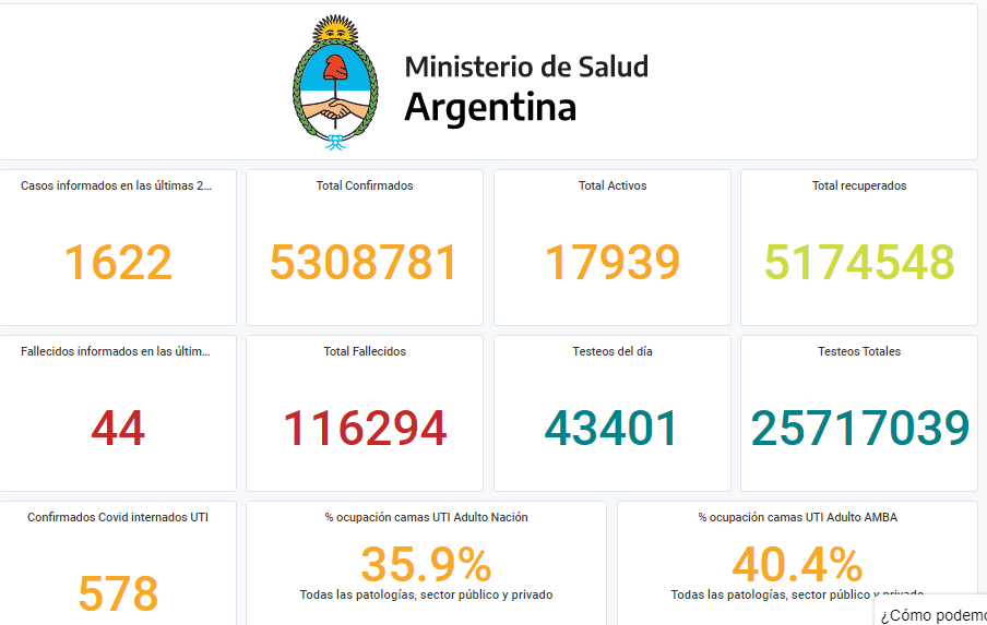 CORONAVIRUS EN ARGENTINA: 1622 NUEVOS CASOS Y 44 FALLECIDOS
