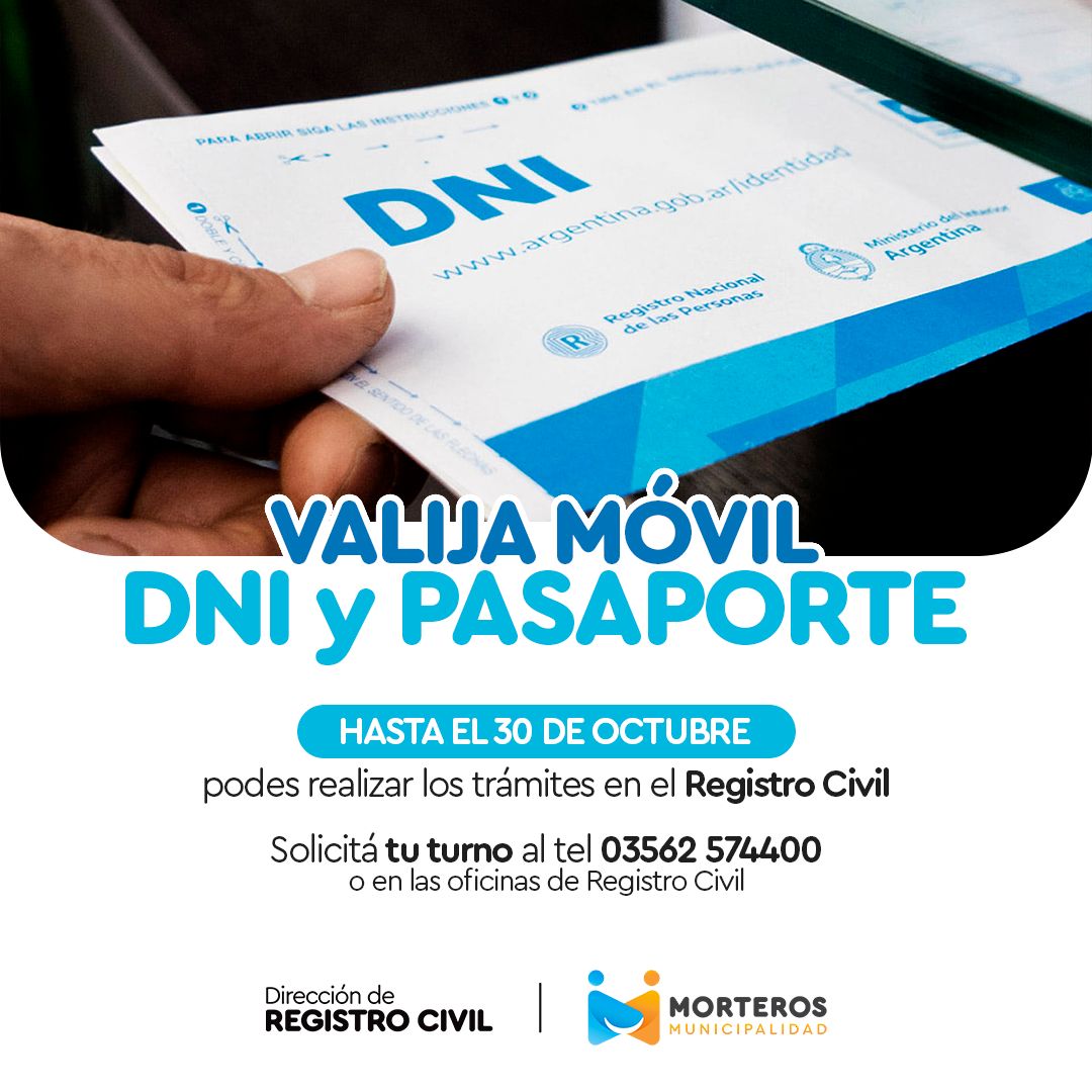 Desde la Municipalidad de Morteros informaron esta semana que la “Valija Móvil” para la gestión de DNI y Pasaporte estará disponible hasta el 30 de octubre en el Registro Civil.