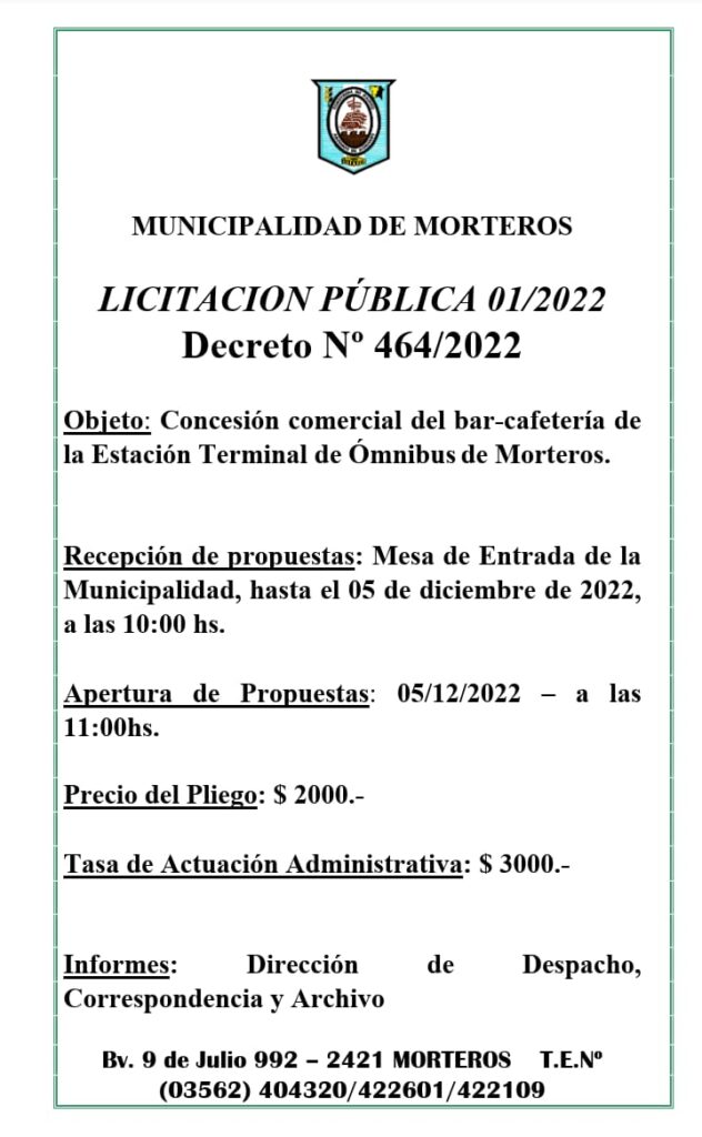 CUÁNDO TERMINA EL LLAMADO A LICITACIÓN PÚBLICA PARA LA CONCESIÓN DEL BAR DE LA TERMINAL DE MORTEROS