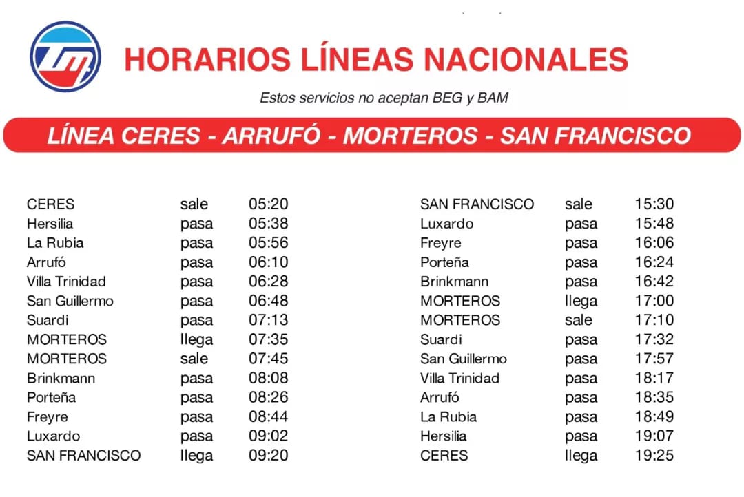 Recordemos que hay dos horarios disponibles: de Ceres saliendo a las 5:20 pasando por Morteros a las 7:35 y llegando a San Francisco a las 9:20. Y de regreso de San Francisco a las 15:30 pasando por Morteros a las 17hs y llegando a Ceres a las 19:25.