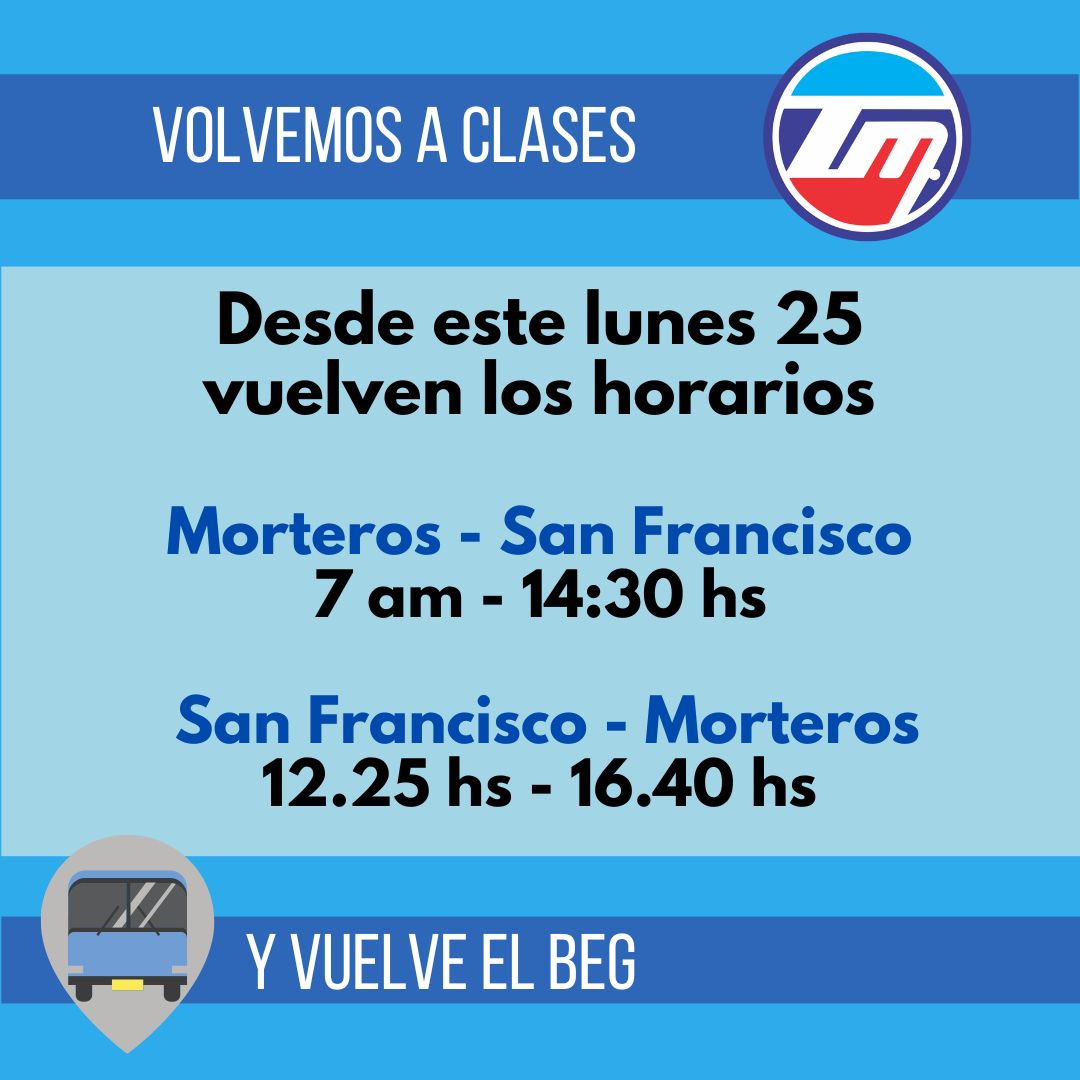 Desde esta semana volvieron los horarios “Escolares” de Morteros a San Francisco 7hs a 14:30 y de San Francisco a Morteros a las 12:45 llegando a las 16:40. Así también la empresa comunicó la vuelta del Boleto Educativo Gratuito.