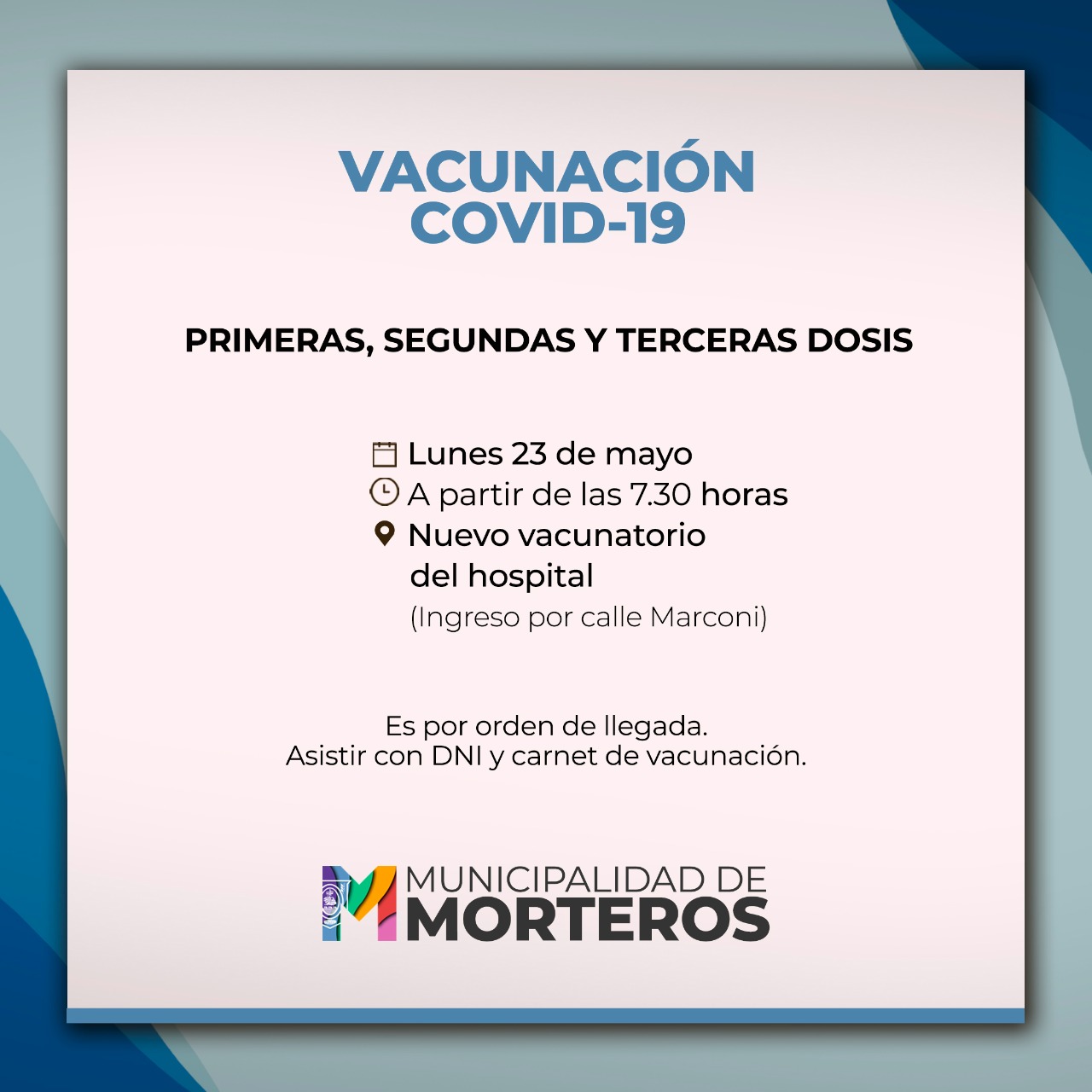 Este lunes 23 de mayo, desde las 7:30 se colocarán en el nuevo vacunatorio las primeras, segundas y tercera dosis. Será por orden de llegada. Deberán asistir con DNI y el carnet de vacunación.