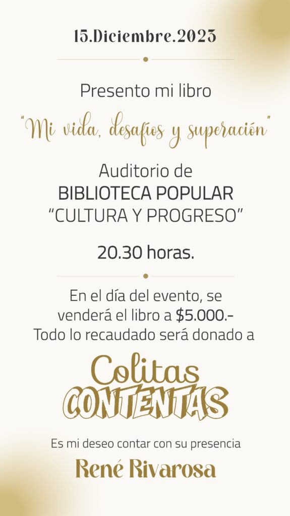 René Rivarosa presentará su “Mi vida, desafíos y superación” este viernes en la Biblioteca Popular “Cultura y Progreso” desde las 20:30hs. En el evento se venderán libros a un valor de 5.000 pesos. Todo lo recaudado será donado a Colitas Contentas.