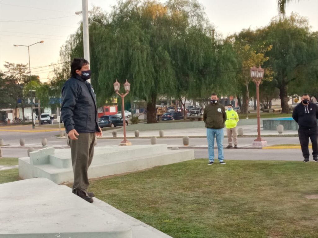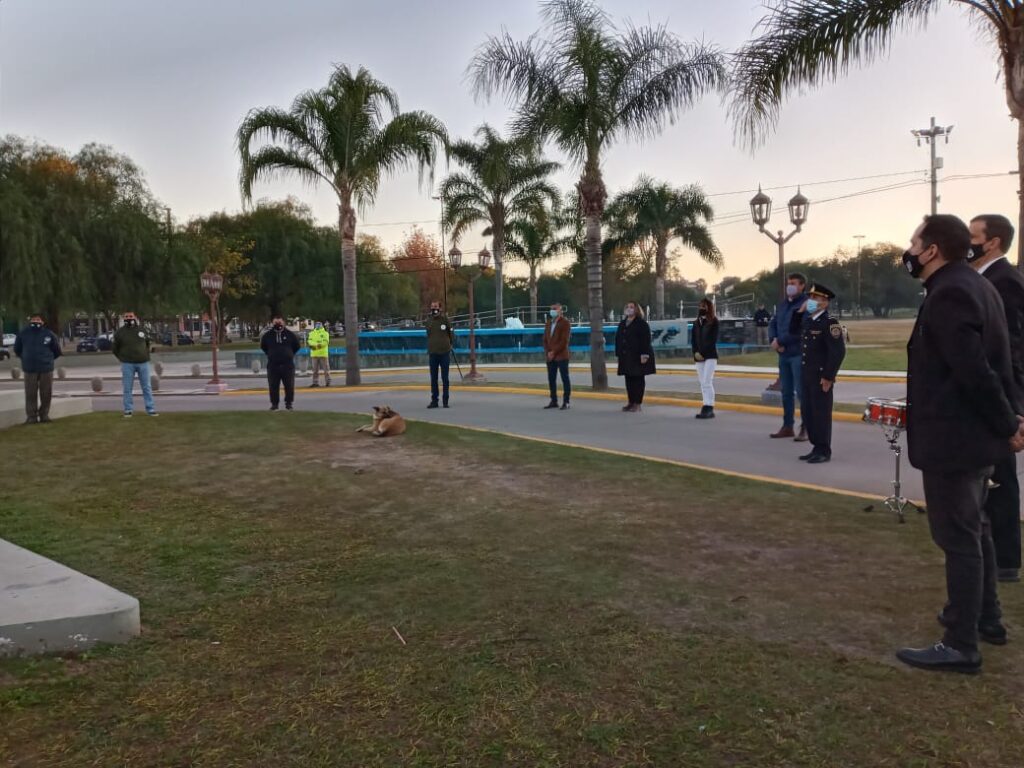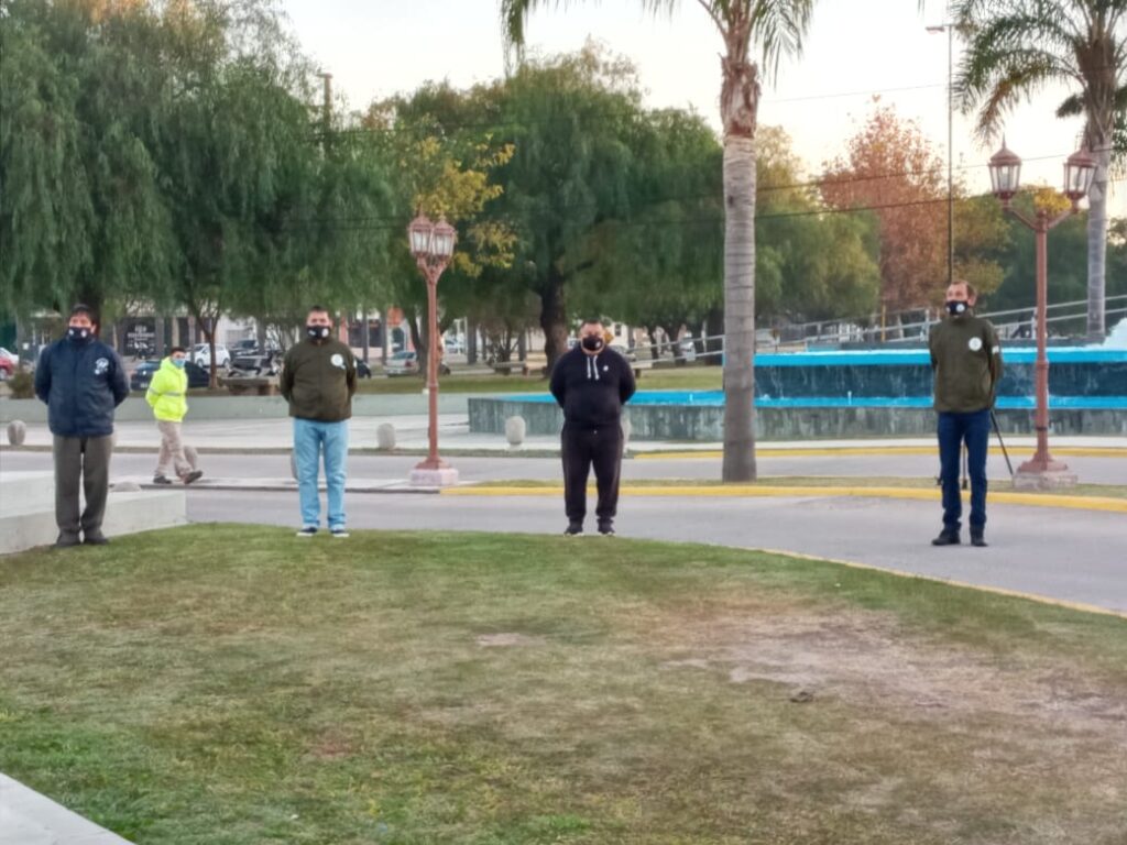 Los veteranos de Malvinas de nuestra ciudad, Daniel Arturo Ruiz, Miguel Galotto, Oscar Sueldo y Roque Luli Weis junto al intendente José Bria, la vice intendenta Valeria Gandino, el secretario de Gobierno, José Poletti, la secretaria de Educación, Discapacidad y Familia Mari Blangetti estuvieron presentes durante el izamiento de la bandera en el parque central de la ciudad, que hoy 14 de junio permanece a media asta en honor a los argentinos caídos en la Guerra de Malvinas.