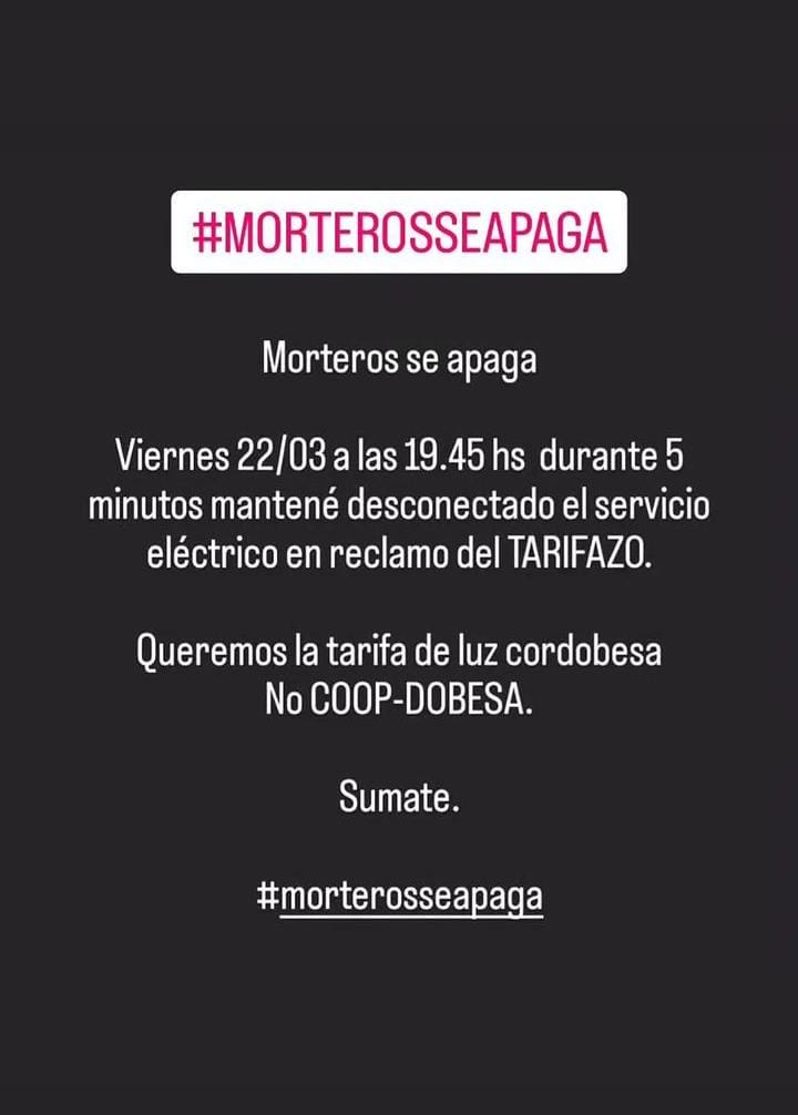 Bajo la consigna “Morteros se apaga” este viernes 22 de marzo a las 19:45hs. “durante 5 minutos mantené desconectado el servicio eléctrico en reclamo del tarifazo”, dice el mensaje.