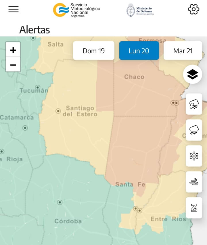 De acuerdo al Servicio Meteorológico Nacional, se prevén tormentas aisladas desde la madrugada hasta la tarde de este lunes, acompañadas por un descenso de temperatura, con una máxima estimada en 21°C El Sistema de Alerta temprana marca – en el mapa – alerta naranja para el Departamento San Cristóbal, pegado al Departamento San Justo.
