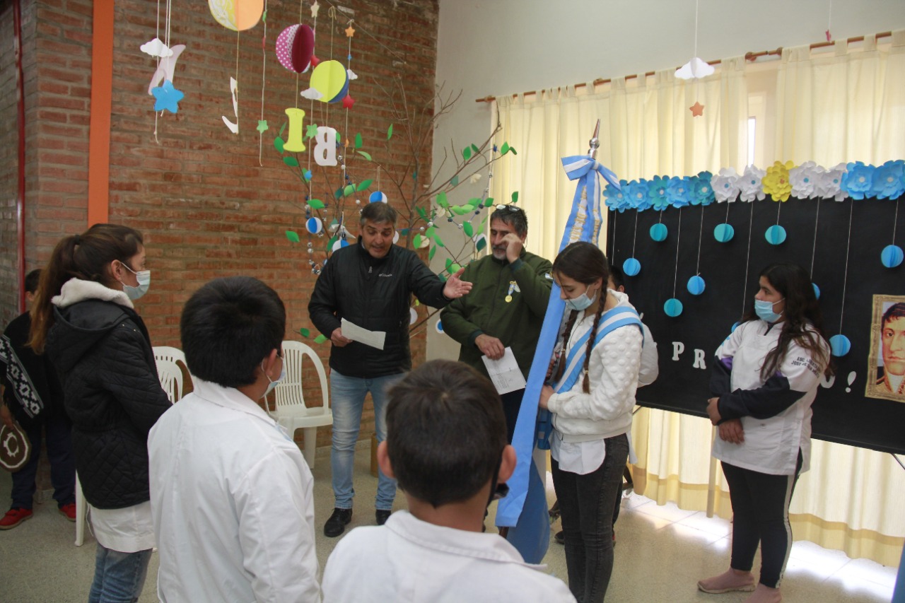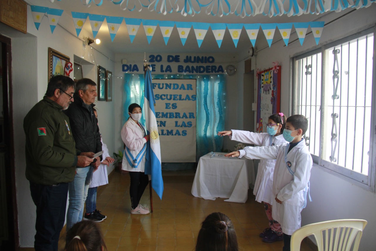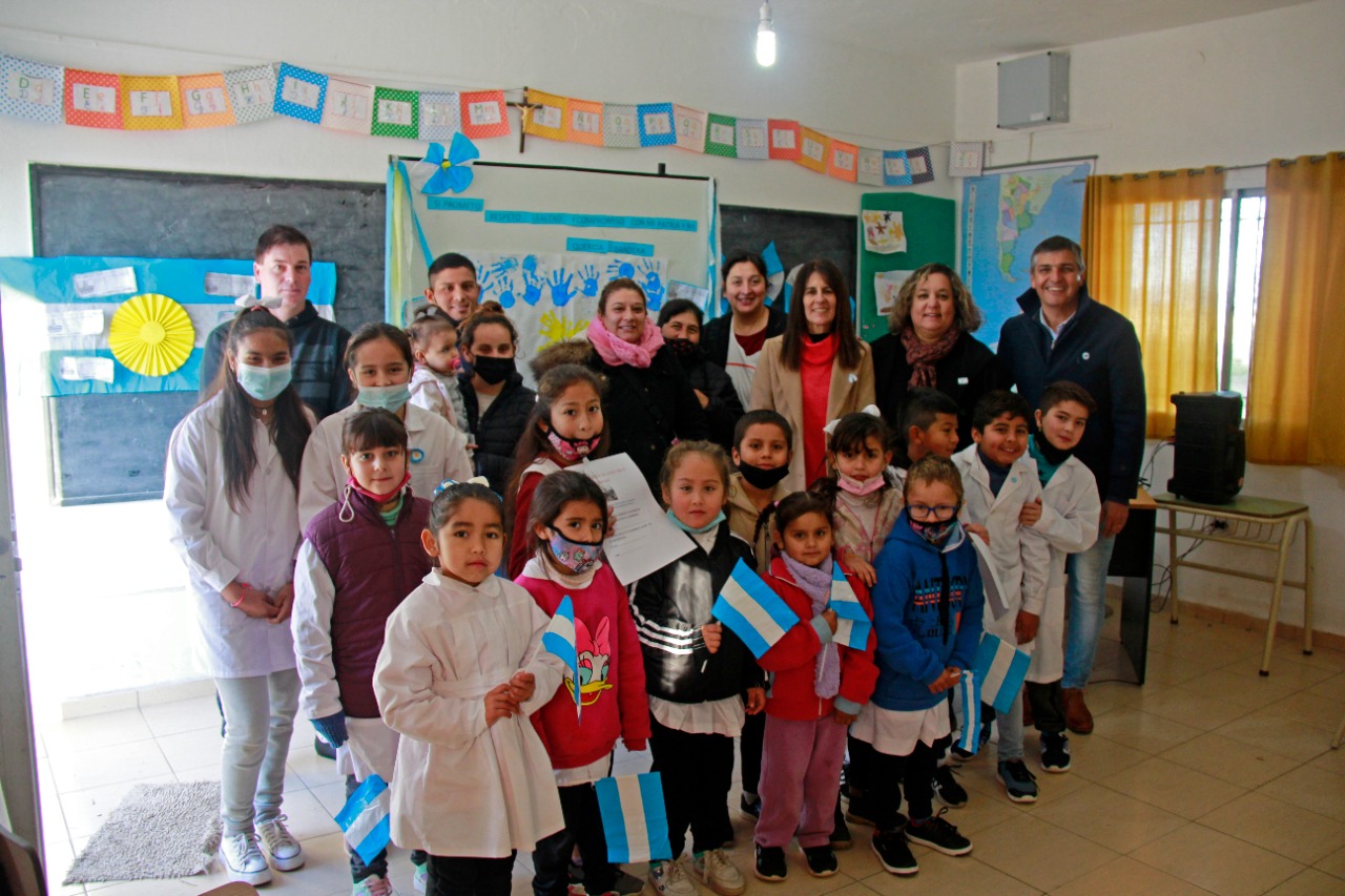El intendente, José Bria, junto a la vice intendente, Valeria Gandino, la Secretaria de Educación, Mary Blangetti, y el ex combatiente de Malvinas, Roque Luli Weiss, visitaron las escuelas rurales para tomarle promesa de lealtad a la bandera a los alumnos de 4° grado de cada institución educativa.