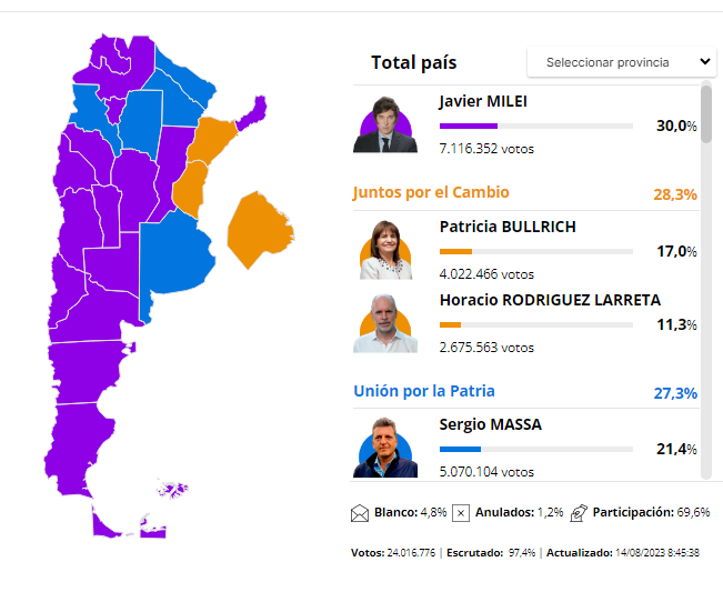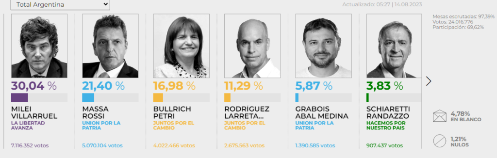 Escrutadas el 97,39% de las mesas, el ganador fue la lista de Milei-Villarruel de Libertad Avanza con el 30,04%, 7.116.352 votos.