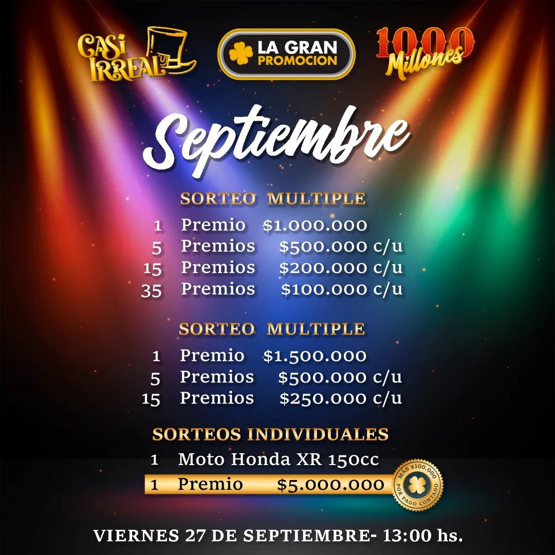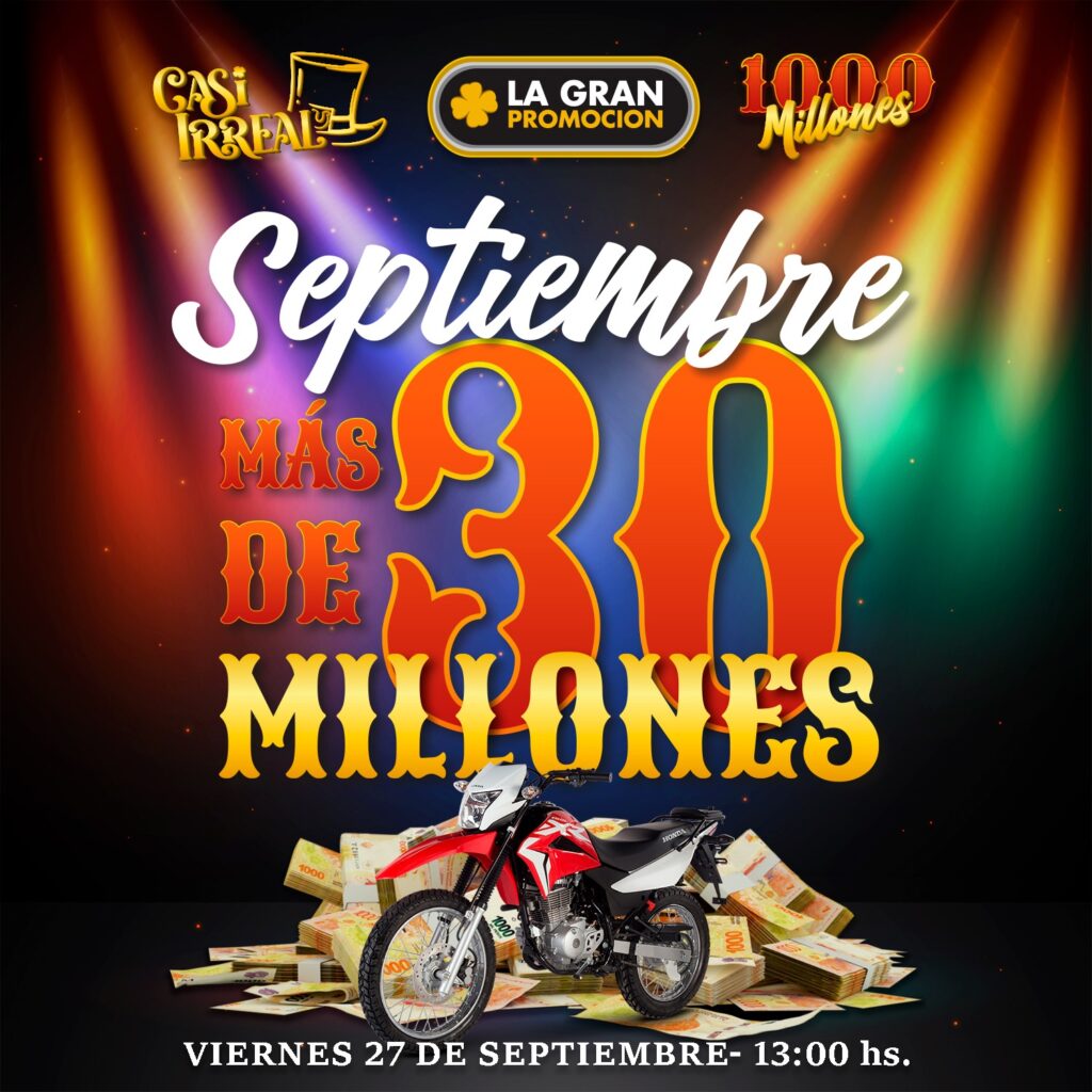 El 27 de septiembre a las 13hs. se llevará a cabo el sorteo del mes con más de 30 millones de pesos en premios.