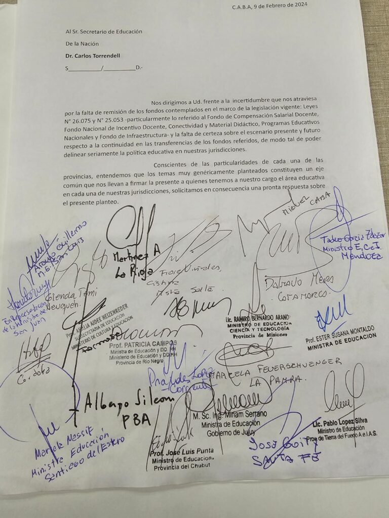 Fue por medio de una nota enviada al Secretario de Educación de la Nación Carlos Torrendell y que fue firmado por todos los ministros y ministras de todo el país.