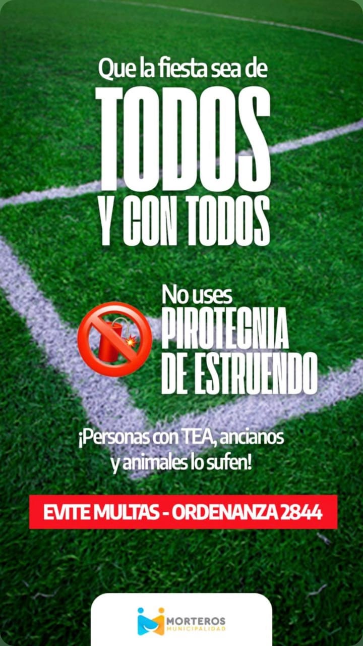 La Municipalidad de Morteros recordó la vigencia de la Ordenanza N.º 2844, que prohíbe el uso, tenencia, comercialización, acopio y transporte de pirotecnia sonora dentro del ejido urbano. Esta normativa tiene como objetivo proteger la salud de personas con condiciones sensibles, como quienes presentan TEA, personas mayores y animales, además de contribuir a la seguridad y al cuidado del medio ambiente.