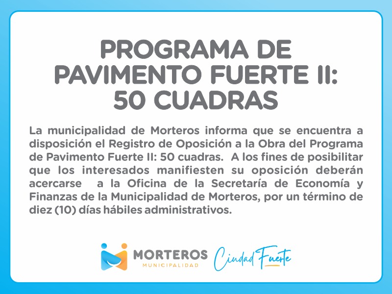 La Municipalidad de Morteros anunció el inicio del Programa de Pavimento Fuerte II, que contempla la ejecución de 50 nuevas cuadras de pavimento en distintos barrios de la ciudad.