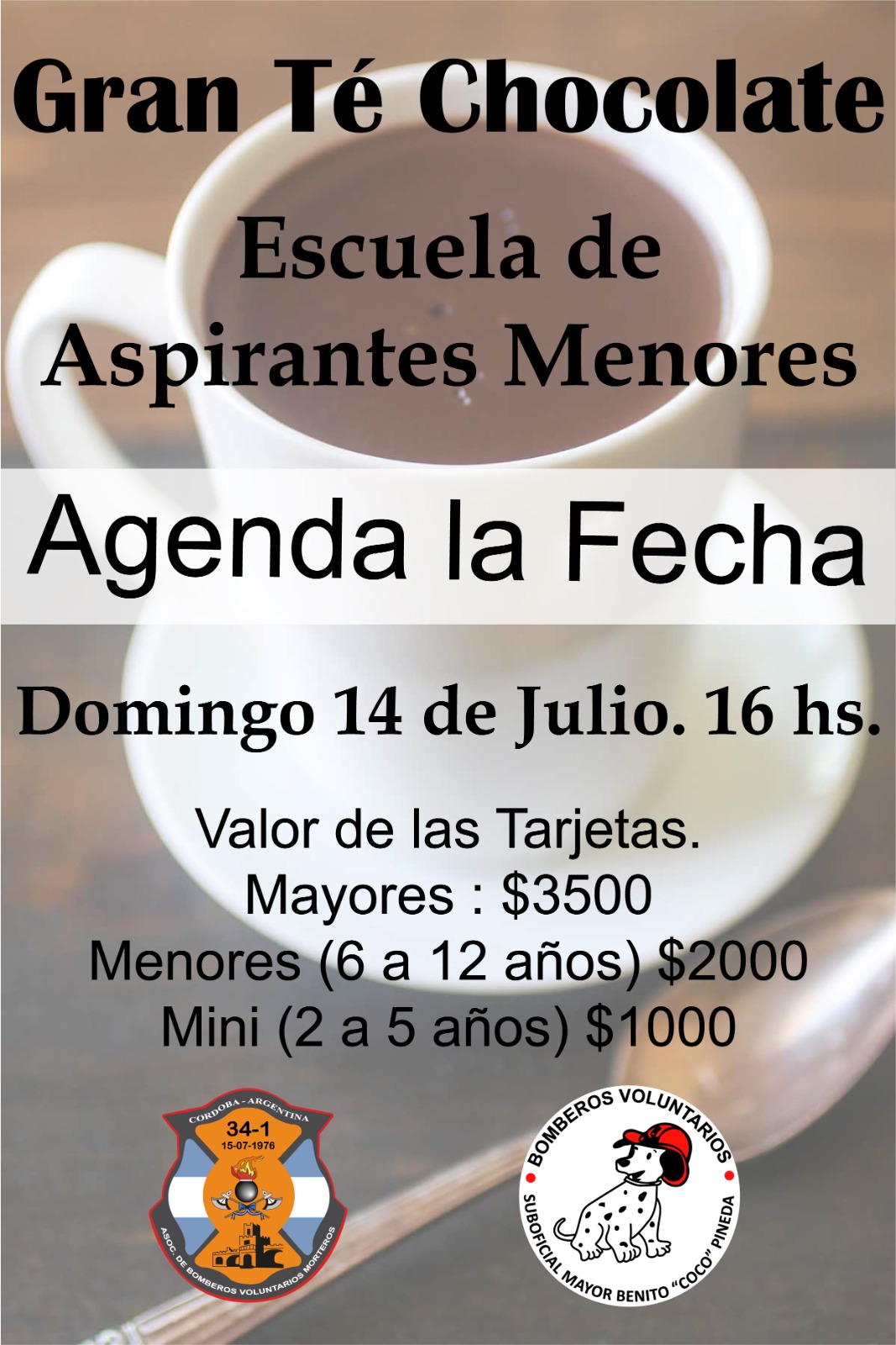 Tal como lo habíamos adelantado, se viene el segundo evento de Té Chocolate, en este caso será el organizado por la Escuelita de Aspirante Menores de Bomberos Voluntarios de Morteros. Será el domingo 14 de julio en Club de Abuelos.
