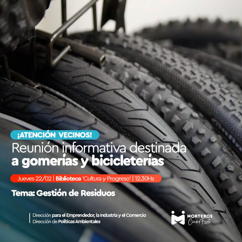 Desde la Dirección de Desarrollo para el Emprendedor, Industria y Comercio, junto con la Dirección de Políticas Ambientales de la Municipalidad de Morteros convoca a una reunión informativa a dueños de gomerías y bicicleterías de la ciudad.
