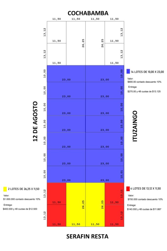 Los 20 lotes están comprendidos entre las calles 12 de agosto, Ituzaingó, Serafín Resta y Cochabamba y constan de las siguientes medidas: 4 lotes de terrenos de 13,12m x 11,50m, con un valor: $700.000 de contado con descuento del 10% y escritura inmediata, o la posibilidad de una entrega inicial $140.000 y 48 cuotas mensuales de $11.667; 14 lotes de 10m x 23m con un valor de $900.000 contado descuento del 10% o entrega inicial de $270.000 y 48 cuotas mensuales de 13.125; 2 lotes de 11,50m x 26,25m de un valor de $1.000.000 contado con un descuento del 10% o entrega de $400.000 y 48 cuotas mensuales de $12.500.