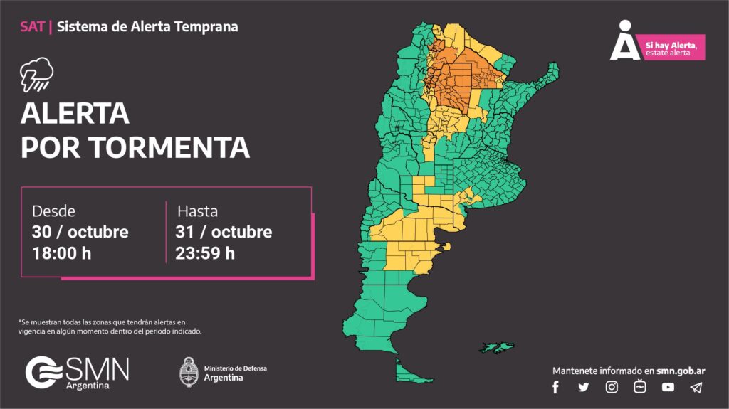 El Servicio Meteorológico Nacional, a través de su Sistema de Alerta Temprana, emitió una alerta amarilla por tormentas para todo el jueves. En su sitio web, destaca además la presencia de viento fuerte del sector norte y un descenso de la temperatura.