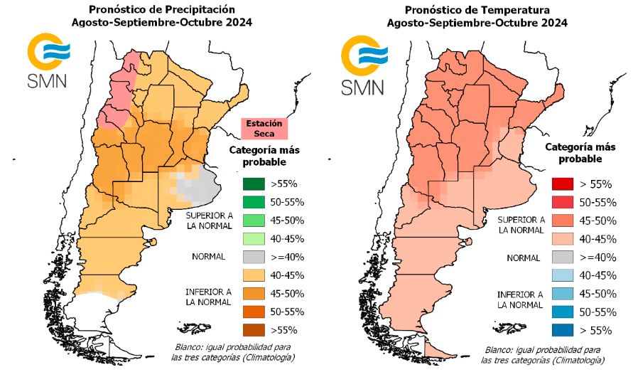 Según el reporte del Servicio Meteorológico Nacional para el trimestre de agosto-septiembre-octubre de este 2024 la tendencia indica temperaturas superiores a las normales y precipitaciones inferiores a las habituales para esta época del año en casi todo el territorio nacional.