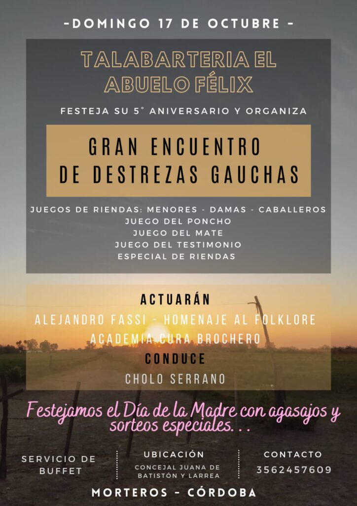 Se festejará el 5to aniversario de Talabarteria el Abuelo Feliz y el Día de la Madre. Participarán Alejandro Fassi, Homenaje al Folclore, Academia Cura Brochero. Especial de Riendas Destrezas Criollas, Danza, Canto y _Baile. Anima “Cholo Serrano”. Habrá servicio de Buffet. El lugar: Concejal Juana de Batistón y Larrea.
